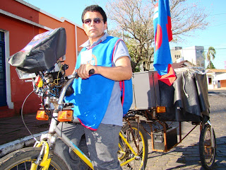 Nesta época de campanha política, são muitos os que trabalham para os candidatos. Um deles é Sabino Fraga de Jesus, que faz uma maratona diária das 9h às 20h em cima de uma bicicleta. Ele percorre as ruas pedalando e carregando um reboque com som e bateria, tocando o jingle de um candidato, disputando espaço com os carros-de-som. “O bom é que meu combustível é só comida e água”, diz Sabino.