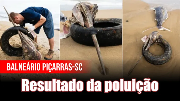 Balneário Piçarras, SC – Um peixe, Marlin-azul, foi encontrado morto na faixa de areia de Balneário Piçarras, no Litoral Norte de Santa Catarina. O animal estava com um pneu preso ao bico, situação que pode ter sido a causa de sua morte. A cena foi registrada na manhã de quarta (12) pelo fotógrafo Mauricio Guartelá, que caminhava pela praia no momento.