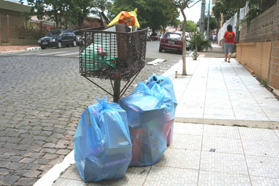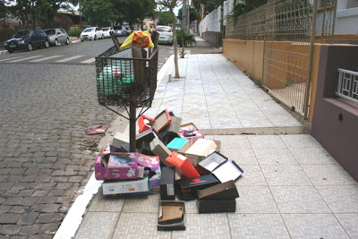 Alguma moradora da Benjamin Constant aproveitou o horário de meio-dia (pouco movimento na rua) para se livrar de mais de uma dezena de caixas de calçados. Ao invés de colocar em sacos e deixar para os recicladores, largou tudo na calçada em frente ao Expresso. Sobrou para o pessoal juntar, colocar nos sacos e largar ao lado da lixeira. Na próxima vez, que faça o serviço direitinho.