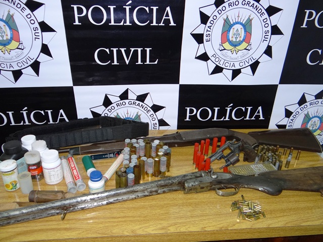 Os policiais civis que estão envolvidos na operação “Respeito” acabam de encontrar duas espingardas e munições na casa de um dos envolvidos em violência contra a mulher. O acusado foi preso e neste momento está na delegacia dando explicações.