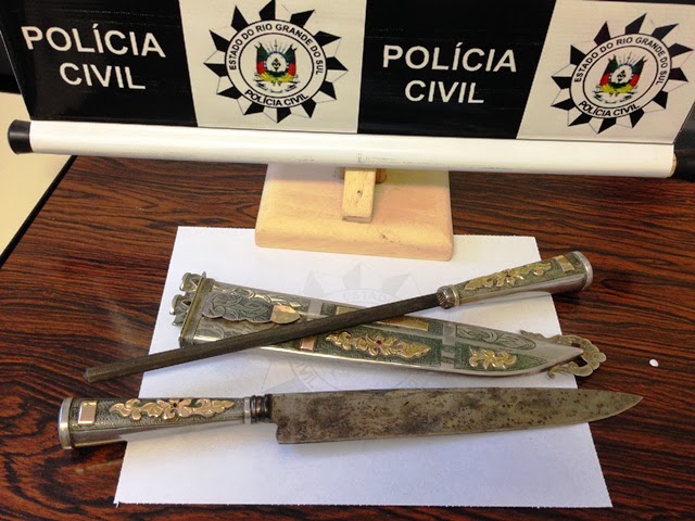Santiago – A Polícia Civil apreendeu uma faca (com chaira e bainha) avaliada em 2.400 numa casa da rua Joaquim de Freitas Cabral – Bonato. A faca, toda trabalhada em ouro e prata, tinha sido furtada de uma residência do mesmo bairro no dia 19/12. Um jovem de 18 anos foi preso por receptação, sendo encaminhado ao presídio.