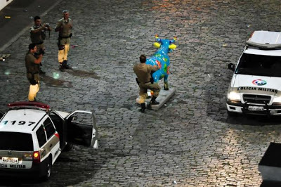 SANTA CATARINA – A imagem de um policial militar fazendo gestos obscenos com uma das vaquinhas da CowParade, (exposição feitas por artistas)  no Mercado Público de Florianópolis, repercutiu nas redes sociais. Em questões de poucas horas, a foto foi compartilhada e comentada pelos internautas, e trouxe consequências administrativas para o PM flagrado e os outros três que participaram da “brincadeira”.