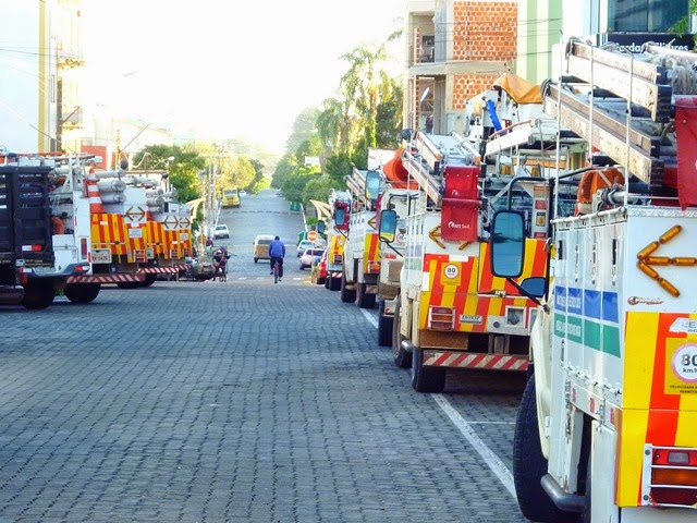 A tormenta da madrugada de domingo deixou milhares de pessoas no escuro. Em Santiago, Unistalda e Capão do Cipó quase 200 postes foram arrancados, além de cabos rompidos e transformadores que caíram. O que era para ser um caos e semanas de espera (caso não tivesse ocorrido a privatização), as equipes da AES Sul estão tirando de letra. Em Santiago a luz já voltou praticamente para todos e nos demais municípios mais de 170 homens estão trabalhando para refazer as redes em tempo recorde. É tanta gente que foi deslocada das cidades vizinhas para cá que foi preciso acomodar o pessoal no hotel Acordes, como mostra esta foto feita ao clarear do dia desta terça. E o pessoal já tava se mexendo pra ir trabalhar.