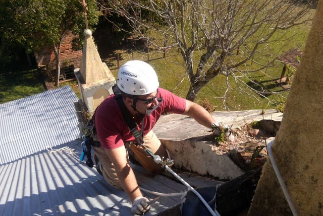 Santiago – Os amigos Paulo César Acosta, Gustavo Disconzi e Leandro Cattelan, que fazem parte do grupo Rapel Santiago, costumam se encontrar aos finais de semana para se divertir ao descer pontes e paredões com suas cordas e equipamentos de segurança. E foi o que eles fizeram neste final de semana em Ernesto Alves, mas desta vez, aliaram a diversão ao trabalho voluntário. Foi graças a habilidade deles que a fachada da igreja Nossa Senhora de Assunção recebeu uma limpeza que estava há horas precisando. Eles retiram plantas que estava crescendo na fachada e no alto da torre, colocaram corda nova no sino e deixaram tudo “brilhando”.