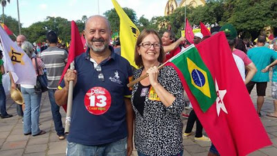 Santiago – O ex-vereador Antônio Bueno (PT) e a professora Liamara Finamor são pré-candidatos à prefeitura de Santiago. Seguindo a ideologia petista, os dois foram uns dos raros petistas que se viu no manifesto domingo. “Participamos do ato em de defesa da democracia e contra o golpe.  Participamos porque temos lado; sempre estivemos e sempre estaremos do lado dos trabalhadores, dos pobres. Seguimos lutando pelos avanços sociais, pela participação popular e contra a corrupção”, declarou Antônio Bueno.
