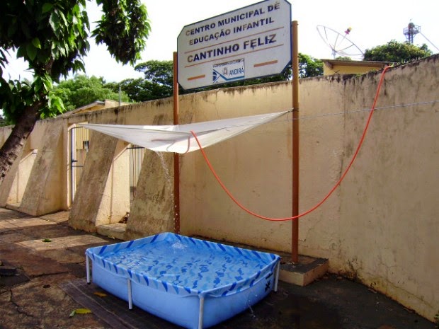 piscina de plástico. Ele não aguentou o calorão de 39ºC e foi se refrescar com