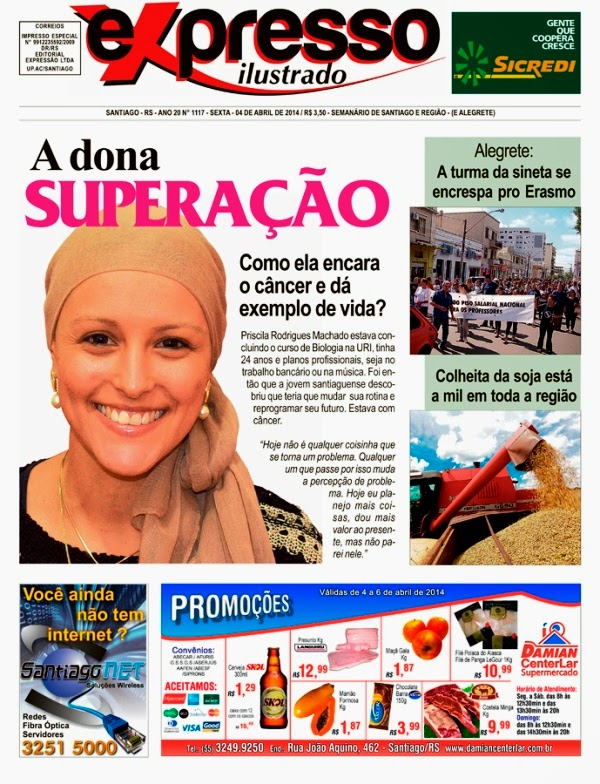 A santiaguense Priscila Rodrigues Machado, que está na fase final de um longo tratamento contra o câncer, foi destaque no jornal Expresso desta semana. A bancária de 25 anos surpreendeu a população com a forma alegre de encarar a doença. A matéria repercutiu nas redes sociais após Priscila agradecer à redação do Expresso pelo trabalho. “Tinha um pouco de receio com a repercussão, porém o resultado foi o melhor possível e muito além de minhas expectativas”, disse. A publicação foi muito comentada e gerou mais de 320 curtidas no Facebook.