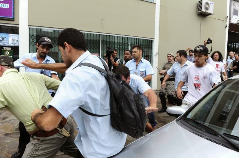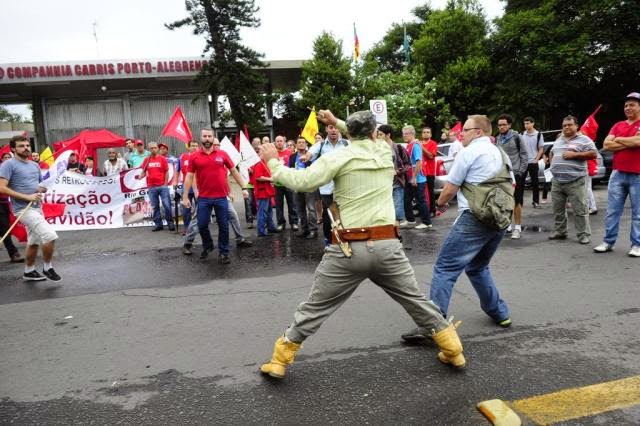 Porto Alegre- Durante protesto de rodoviários nesta quarta um homem feriu uma pessoa e acabou agredido pelos outros. João Carlos Fabrin (47 anos) chegou bem cedindo de moto, deu umas voltas, estacionou e atirou o capacete nos protestantes. Depois, colocou uma garrafa com leite no chão, puxou uma chaira (todos acharam que fosse uma faca) e partiu pras ameças. A Brigada chegou e o vivente deu no pé, seguido por várias pessoas. Levou uma sumanta de pau e foi parar na delegacia. (Fonte e fotos; Zero Hora).