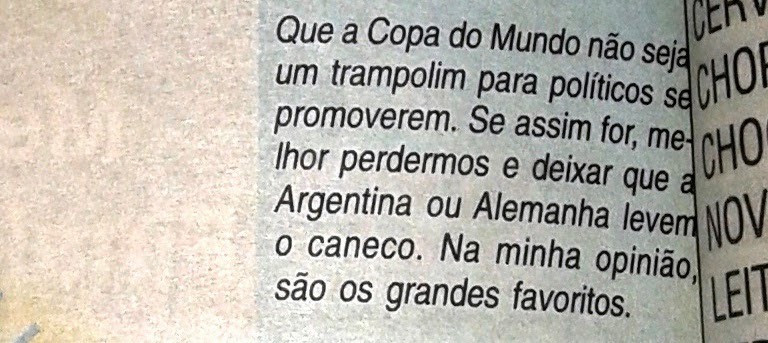 Na tarde de hoje o mundo se volta para o Maracanã, durante a disputa da final da Copa do Mundo. Como eu havia previsto em 28 de dezembro, Alemanha e Argentina farão a final, sem favoritismo de um ou outro. Acontece que estas equipes são, sem dúvida, as duas melhores do mundo. Os hermanos jogam com sua tradicional garra. Os alemães, com um futebol técnico. Não esquecendo que jamais uma seleção da Europa ganhou Copa na América. Será desta vez, ou a Argentina vai manter a escrita?