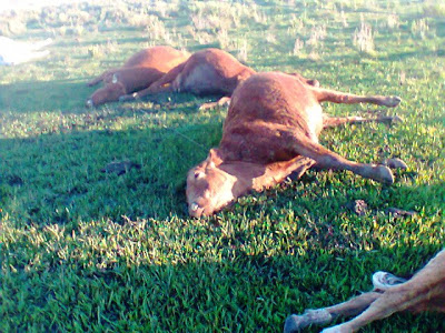 O dono destas cinco vacas e de um touro Nelore teve um prejuízo de mais de 10 mil reais nesta semana. Ele mora em Rincão dos Soares, interior de Santiago, e a ventania derrubou um poste podre da AES Sul. O fio eletrocutado ficou no campo e os animais que encostaram foram “torrados” instantaneamente. Ele já avisou a empresa e espera pela indenização.