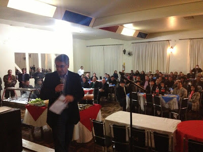 Nesta quarta-feira, 19, o ex-governador Germano Rigotto esteve cheio de compromissos em Santiago. Pela manhã, ele participou do projeto Ideias na Mesa, palestrando para lideranças locais no Centro Empresarial. À noite, foi a atração na Semana Acadêmica do curso de Ciências Contábeis da URI. Após, ele foi recebido por mais de 200 filiados do PMDB do Vale do Jaguari, no Clube Sete de Setembro. A foto acima foi divulgada pelo próprio Rigotto, em seu perfil no Twitter, comemorando a organização de seus companheiros locais.