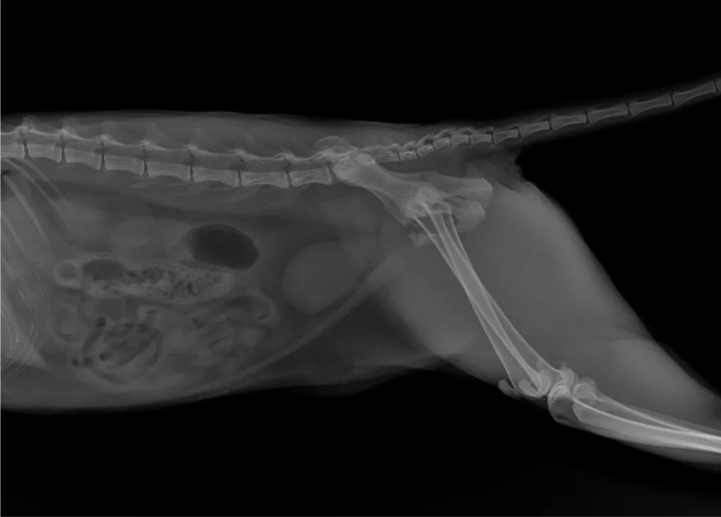 Infelizmente, ela sofreu uma fratura no quadril e, desde então, não consegue se locomover ou apoiar os membros posteriores, provavelmente sentindo muitas dores.
