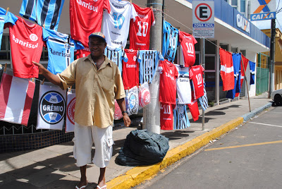 Começa nesta quinta-feira a 25ª edição da Copa Santiago. E como sempre, o evento esportivo atrai pessoas de outras cidades, incluindo os vendedores ambulantes. É o caso de Sebastião Lopes, que veio de longe, lá de Uruguaiana só pra tentar ganhar um dinheiro vendendo camisetas e almofadas do Grêmio e do Internacional. “Dá pra ganhar um troco bom. Paga a hospedagem, o transporte, a comida e ainda sobra”, garante o vendedor, que durante o dia está vendendo seu material perto da Caixa Federal e nos horários dos jogos acha um lugar na esquina do estádio Alceu Carvalho.