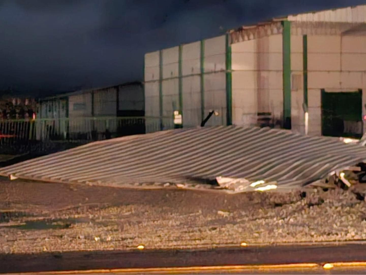 O vento arrancou a cobertura do galpão de defensivos na Unidade de São Gabriel e a jogou sobre o portão de acesso.