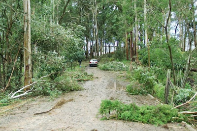 Vendaval arrancou árvores, derrubou postes e destelhou casas.