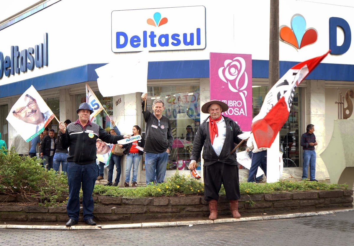 Se durante o primeiro turno para o governo do RS pouco se viu a campanha de Sartori em Santiago, após a eleição isso mudou. O gringo de Caxias teve 9.559 votos, 2 mil e 460 a mais do que Ana Amélia, a candidata do PP, partido que governa o município. Com isso, o PMDB local reanimou os filiados e foi pras ruas, tendo na linha de frente vereadores, ex-vereadores, assessores e a campanha ainda ganhou a adesão de companheiros de outras siglas, como do PSDB, e do PP, que ajudaram a distribuir material e a fazer bandeiradas. Não é à toa que Sartori desponta nas pesquisas. A mais recente mostra ele com 60% contra 40% de Tarso.