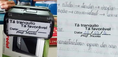 Espírito Santo – O professor de biologia Nicola Cano (61 anos), está estimulado seus alunos com um carimbo que faz referência a música “Tá Tranquilo, Tá Favorável”, de MC Bin Laden. Conforme o professor, ele sempre teve o hábito de usar carimbo como uma forma de agilizar as correções das atividades dos alunos. A frase foi escolhida para que seus alunos tivessem mais vontade de estudar.