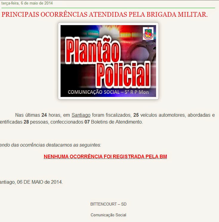 Geral InícioGeral Sem alteração! Publicado em 06/05/2014 POR NP Expresso FacebookTwitterWhatsAppLinkedinTelegram A semana começou tão calma que não foram registradas ocorrências policiais. Que continue assim! DEIXE UMA RESPOSTA Cancelar resposta Comentário: Por favor digite seu comentário! Nome:* Por favor, digite seu nome aqui E-mail:* Você digitou um endereço de e-mail incorreto! Por favor, digite seu endereço de e-mail aqui Site: Salve meu nome, e-mail e site neste navegador para a próxima vez que eu comentar. Siga o NP Expresso 184.758 132,509FãsCurtir 72,377SeguidoresSeguir Notícias Recentes Estado Um bucho bovino vencido desde 2017 chamou atenção Farroupilha - RS - (Região de Caxias do Sul) - Segundo as equipes que... 12/03/2026 Estado Operação apura fraude de 20 milhões em editais de pesquisa Passo Fundo – RS – Um grupo formado por pesquisadores, empresários e um servidor... 12/03/2026 Acidentes Trabalhador rural m0rre após ac1dente com maquinário Almirante Tamandaré do Sul - RS - (Região de Passo Fundo) - Um trabalhador... 12/03/2026 Estado As armas sem numeração ou identificação dificultam o rastreamento Cachoeirinha, RS - Uma operação contra uma organização que fabricava armas com impressoras 3D... 12/03/2026 Leia Também Estado Um bucho bovino vencido desde 2017 chamou atenção Farroupilha - RS - (Região de Caxias do Sul) - Segundo as equipes que... 12/03/2026 Estado Operação apura fraude de 20 milhões em editais de pesquisa Passo Fundo – RS – Um grupo formado por pesquisadores, empresários e um servidor... 12/03/2026 Acidentes Trabalhador rural m0rre após ac1dente com maquinário Almirante Tamandaré do Sul - RS - (Região de Passo Fundo) - Um trabalhador... 12/03/2026 VER TODAS AS NOTÍCIAS