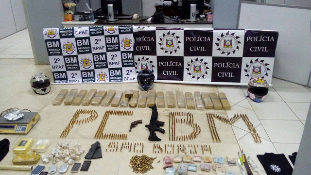 Na operação, foram apreendidos 23,9 quilos de maconha, 2,2 quilos de crack e 1,85 quilos de cocaína, além de um revólver, um fuzil e 750 munições mais 13 reais. Também foram apreendidas duas camisetas da Polícia, uniforme militar, balança, facas, celulares e motocicletas.