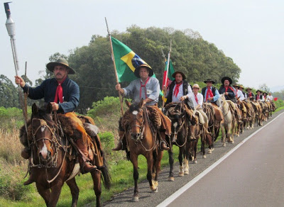 SÃO VICENTE – Os cavalarianos da Chama Crioula passaram por São Vicente na semana passada. Eles saíram de Venâncio Aires e conduziram a Centelha até Alegrete, sede da 4ª Região Tradicionalista. A gauchada vai percorrer um total de 650 km no lombo do pingo e pararam para almoçar no CTG Cancela da Fronteira.