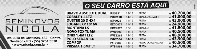 Geral InícioGeral Seminovos Nicola Veículos Publicado em 22/11/2017 POR NP Expresso FacebookTwitterWhatsAppLinkedinTelegram DEIXE UMA RESPOSTA Cancelar resposta Comentário: Por favor digite seu comentário! Nome:* Por favor, digite seu nome aqui E-mail:* Você digitou um endereço de e-mail incorreto! Por favor, digite seu endereço de e-mail aqui Site: Salve meu nome, e-mail e site neste navegador para a próxima vez que eu comentar. Siga o NP Expresso 184.758 132,618FãsCurtir 73,451SeguidoresSeguir Notícias Recentes Estado Produtores conseguem suspender cobrança de royalties da soja São Vicente do Sul, RS - Três produtores rurais conseguiram na Justiça suspender a... 24/03/2026 Nacional Jovem esfaqueia namorado e diz que agiu em legítima defesa Maceió, Alagoas - Bia Correia, de 21 anos, feriu o namorado, de 22, com... 24/03/2026 Geral Projeto Taifa descobre novos talentos da música Santiago - RS - (Região do Vale do Jaguari) - O sonho de transformar... 24/03/2026 Geral Mentoria com Quésia Vieira no Chuva de Ideias na reta final de inscrições Santiago, RS - A mentora Quésia Vieira será a responsável por conduzir a próxima... 24/03/2026 Leia Também Estado Produtores conseguem suspender cobrança de royalties da soja São Vicente do Sul, RS - Três produtores rurais conseguiram na Justiça suspender a... 24/03/2026 Nacional Jovem esfaqueia namorado e diz que agiu em legítima defesa Maceió, Alagoas - Bia Correia, de 21 anos, feriu o namorado, de 22, com... 24/03/2026 Geral Projeto Taifa descobre novos talentos da música Santiago - RS - (Região do Vale do Jaguari) - O sonho de transformar... 24/03/2026 VER TODAS AS NOTÍCIAS