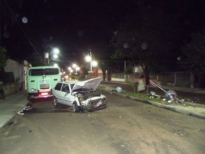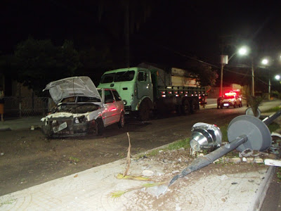 Cacos de batida agora pela manhã na Sete de Setembro. Eram quase sete horas quando este Uno vinha no sentido centro/Alto da Boa Vista e o motorista se perdeu. Arrancou uma luminária do canteiro central, rodopiou, ficou no sentido contrário e por muito pouco não foi parar embaixo de um caminhão estacionado.