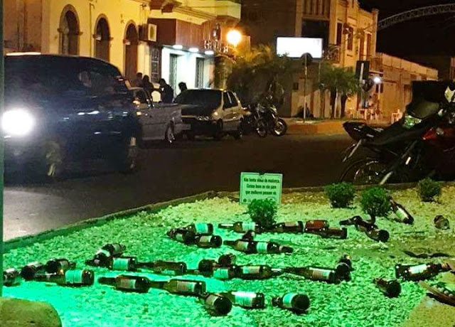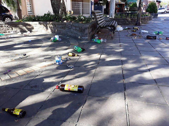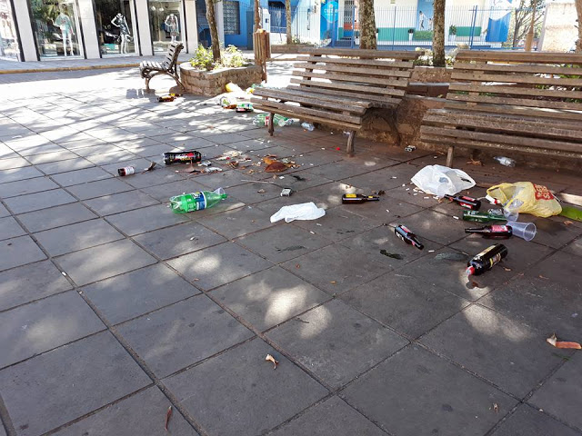Essas fotos foram tiradas pelo santiaguense Alberto Freitas (Gonô) na manhã de sábado na Rua dos Poetas, perto do Ilha Bella. O local é um dos preferidos dos grupinhos de jovens que amanhecem bebendo e deixam toda essa sujeira para o pessoal da Prefeitura limpar.