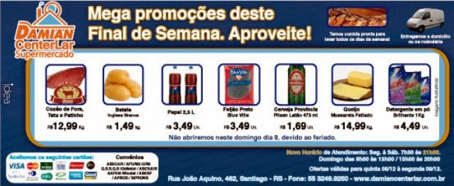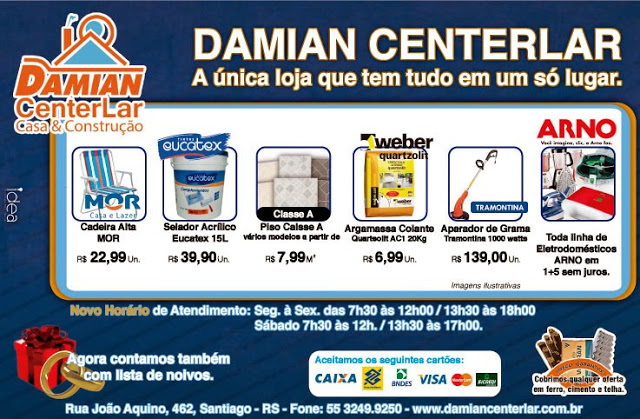 Geral InícioGeral Sexta é dia de ofertas no Damian Center Lar Publicado em 06/12/2013 POR NP Expresso FacebookTwitterWhatsAppLinkedinTelegram Promoções válidas para sexta e sábado. Domingo é feriado, antecipe suas compras. DEIXE UMA RESPOSTA Cancelar resposta Comentário: Por favor digite seu comentário! Nome:* Por favor, digite seu nome aqui E-mail:* Você digitou um endereço de e-mail incorreto! Por favor, digite seu endereço de e-mail aqui Site: Salve meu nome, e-mail e site neste navegador para a próxima vez que eu comentar. Siga o NP Expresso 184.758 132,385FãsCurtir 72,190SeguidoresSeguir Notícias Recentes Geral Escritório da esposa de Alexandre de Moraes diz ter feito 94 reuniões com Banco Master Brasília - DF - O escritório da advogada Viviane Barci de Moraes, esposa do... 09/03/2026 Estado Santiaguense é selecionada para pós-graduação da UFRGS Santiago – RS – Karine Diniz Herte (45 anos), bibliotecária da Biblioteca Pública Municipal... 09/03/2026 Estado RS: Ensino superior no campo é o dobro da média nacional Pesquisa da Associação Brasileira de Marketing Rural e Agro (ABMRA) aponta que 19% dos... 09/03/2026 Acidentes Identificadas vítimas fatais de acidente na BR-392 Guarani das Missões (Região de Santo Ângelo), RS - Adílson Luiz Lapinski, de 43... 09/03/2026 Leia Também Geral Escritório da esposa de Alexandre de Moraes diz ter feito 94 reuniões com Banco Master Brasília - DF - O escritório da advogada Viviane Barci de Moraes, esposa do... 09/03/2026 Estado Santiaguense é selecionada para pós-graduação da UFRGS Santiago – RS – Karine Diniz Herte (45 anos), bibliotecária da Biblioteca Pública Municipal... 09/03/2026 Estado RS: Ensino superior no campo é o dobro da média nacional Pesquisa da Associação Brasileira de Marketing Rural e Agro (ABMRA) aponta que 19% dos... 09/03/2026 VER TODAS AS NOTÍCIAS