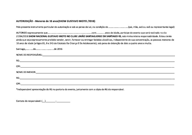 Os menores deverão levar autorização assinada pelos pais ou responsável e entregar na entrada do evento. Quem tem até 15 anos precisará estar com algum responsável e ter uma autorização (assinatura e cópia do RG do responsável). Para jovens de 16 e 17 anos será necessária apenas a apresentação da autorização e um documento com foto. Fone: 99947 3076.