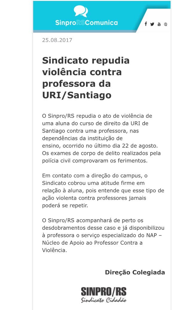 Geral InícioGeral Sindicato repudia violência contra professora em Santiago Publicado em 30/08/2017 POR NP Expresso FacebookTwitterWhatsAppLinkedinTelegram DEIXE UMA RESPOSTA Cancelar resposta Comentário: Por favor digite seu comentário! Nome:* Por favor, digite seu nome aqui E-mail:* Você digitou um endereço de e-mail incorreto! Por favor, digite seu endereço de e-mail aqui Site: Salve meu nome, e-mail e site neste navegador para a próxima vez que eu comentar. Siga o NP Expresso 184.758 132,618FãsCurtir 73,451SeguidoresSeguir Notícias Recentes Geral Polícia Ambiental flagra coleta ilegal de pinhão verde Teixeira Soares, Paraná - Dois sujeitos fugiram após perceber a presença de policiais durante... 24/03/2026 Estado Faculdade suspende oito alunos após circulação de lista ofensiva contra alunas Pelotas - RS - (Região Sul) - O Instituto Federal Sul-rio-grandense (IFSul) agiu com... 24/03/2026 Geral Governo amplia limites do Minha Casa, Minha Vida O Conselho Curador do FGTS aprovou, nesta terça (24), a ampliação dos limites de... 24/03/2026 Geral John Deere amplia atuação no RS com novos equipamentos Canoas - RS - (Região Metropolitana) – Rodrigo Bonatto destacou novos investimentos da John... 24/03/2026 Leia Também Geral Polícia Ambiental flagra coleta ilegal de pinhão verde Teixeira Soares, Paraná - Dois sujeitos fugiram após perceber a presença de policiais durante... 24/03/2026 Estado Faculdade suspende oito alunos após circulação de lista ofensiva contra alunas Pelotas - RS - (Região Sul) - O Instituto Federal Sul-rio-grandense (IFSul) agiu com... 24/03/2026 Geral Governo amplia limites do Minha Casa, Minha Vida O Conselho Curador do FGTS aprovou, nesta terça (24), a ampliação dos limites de... 24/03/2026 VER TODAS AS NOTÍCIAS