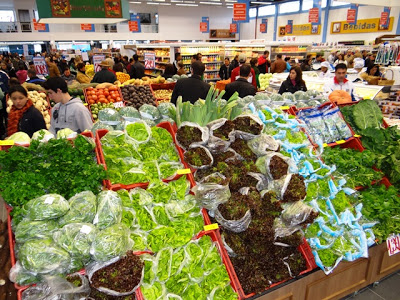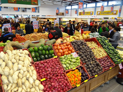 Setor de frutas e legumes com produtos selecionados.