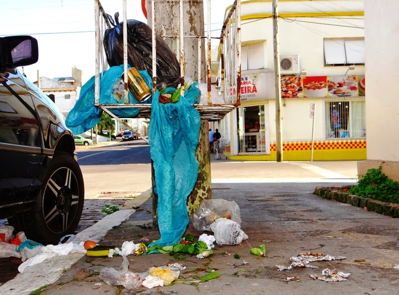 Santiago – Cenas como esta serão evitadas com a colocação de contêineres em algumas ruas do centro de Santiago, onde a cachorrada costuma espalhar o lixo pela calçada, como neste caso na João Escobar Carpes, esquina com a Bento Gonçalves. Nas ruas que terão os equipamentos a Ansus não recolherá o lixo que for colocado em lixeiras na frente das casas em árvores e postes.