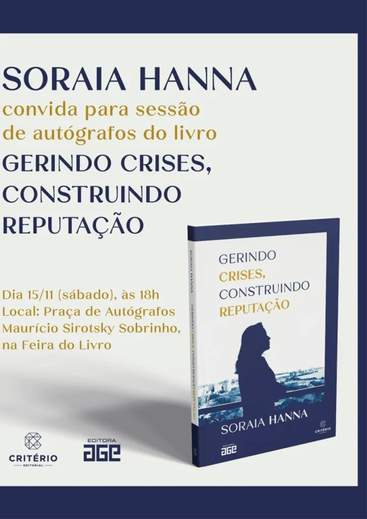 Porto Alegre/RS – A jornalista Soraia Hanna, sócia-diretora executiva da Critério – Resultado em Opinião Pública, autografa neste sábado (15), na Feira do Livro, seu livro “Gerindo crises, construindo reputação”. O lançamento ocorrerá às 18h, na Praça de Autógrafos Maurício Sirotsky Sobrinho.