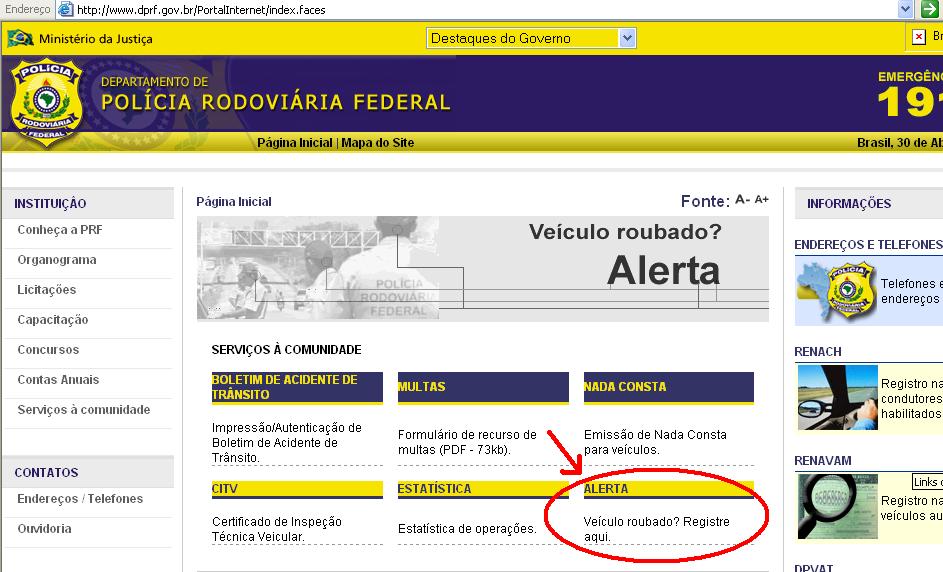 A Polícia Rodoviária Federal criou um serviço chamado Alerta, para registro de carros roubados/furtados. Se seu veículo foi roubado e você fizer o cadastro no site, será enviado um e-mail para mais de 400 blitz da Polícia Rodoviária, além de 480 viaturas que possuem comunicação via satélite.