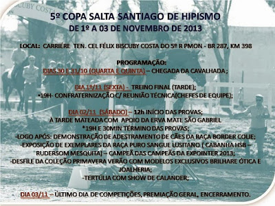 Em comemoração aos 37 anos de instalação do 5º RPMon, a Brigada promoverá a 4ª Copa Salta Santiago de Hipismo. A temporada hípica acontece no sábado e domingo e mais de 100 conjuntos (cavalo e cavaleiro) representando várias regiões do Estado e do exterior são aguardados. Ao longo dos dias de provas os competidores disputarão várias séries, com obstáculos entre 0,60 metros e 1,20. A entrada é gratuita.