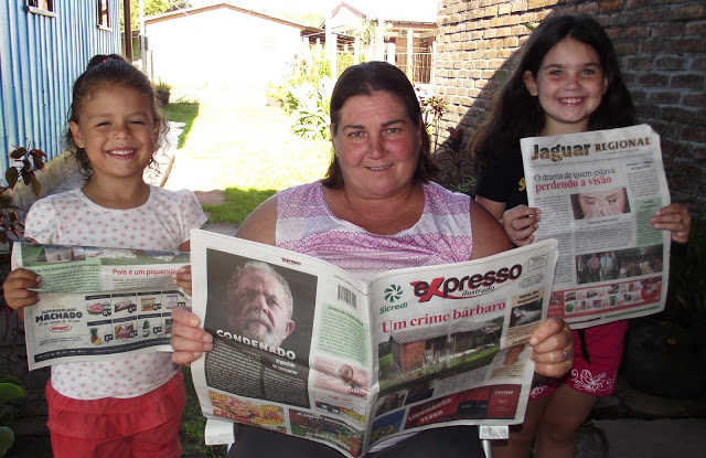 Jaguari – Loreni Aparecida Roity é assinante há 4 anos e não desgruda do Expresso. Ela conta que pegou o gosto pelo jornal quando trabalho de doméstica e o seu ex-patrão era assinante. “Há quatro anos o meu patrão se mudou de cidade. E como já tinha pegado o hábito de ler o jornal, fiquei com a assinatura. Eu não gosto dessa tal de internet e por isso leio o Expresso aos poucos para ter notícias pra todo o final de semana”, diz Loreni. Na foto, a leitora com a filha e a sua sobrinha.