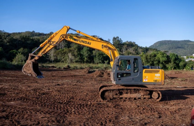 Na sexta-feira, (14) a Secretaria de Desenvolvimento Urbano e Metropolitano (Sedur) iniciou os trabalhos de terraplanagem e topografia em Muçum para construir 56 casas do programa “A Casa é Sua – Calamidade”.