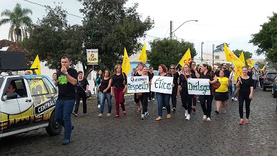 Santiago – A vereadora Iara Castiel (PT) não deixou o protesto da segurança passar quieto em Santiago. Deu de mão na sua cuia e foi pra rua festejar, digo, protestar com os servidores públicos sem salários. Assim ela publicou: “Manifestação do Funcionalismo Público em Santiago contra a política de desmonte e desrespeito do Governo Sartori.”