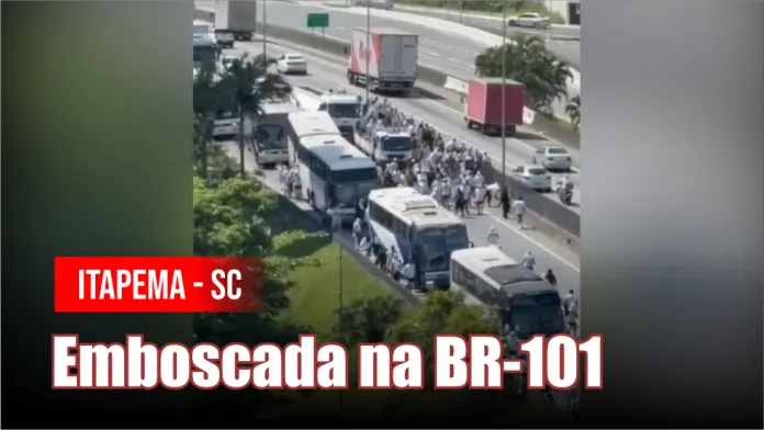 Itapema – SC – Um ônibus com torcedores do Inter foi alvo de uma emboscada na manhã desta quinta (4) na BR-101, em Itapema, Santa Catarina. O ataque foi realizado por membros da Torcida Jovem do Santos, que aguardaram a passagem dos colorados e avançaram contra o veículo com paus e pedras.