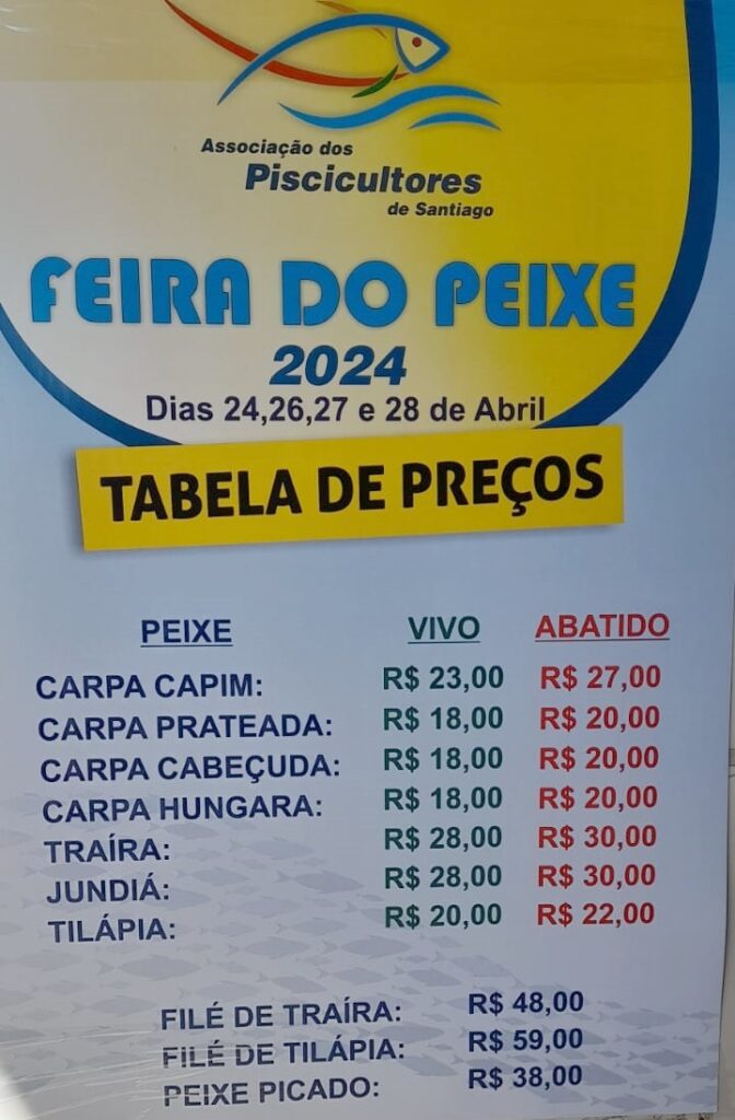Conforme o presidente da associação, Thiago Machado, as carpas são o carro-chefe da feira e os santiaguenses também encontram tilápias, traíras, piavas, filés e outras opções. A novidade para esta edição são os bolinhos e pastéis de peixe.