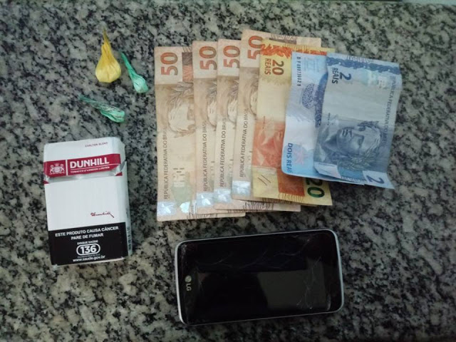 maconha, telefones celulares e dinheiro. Três pessoas foram presas em