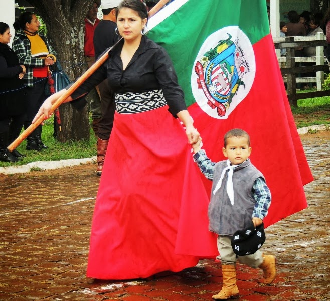 Este peãozinho e esta prenda que desfilaram em Unistalda mostram que o gaúcho ama suas coisas mais do que qualquer outro brasileiro. Aí brota a ideia do acampamento farroupilha. (foto: site unistaldense)
