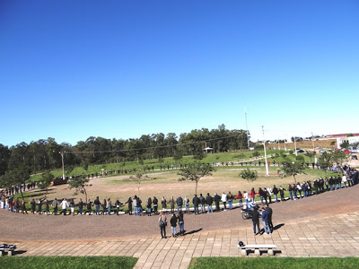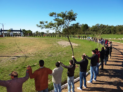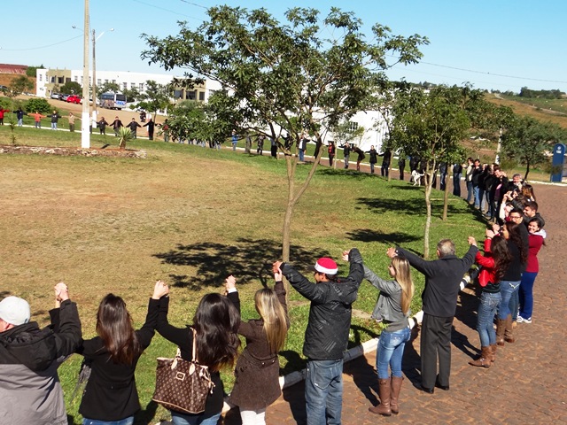 Direção, professores, funcionários e acadêmicos da URI deram um grande abraço na universidade agora à tarde. A homenagem faz parte da programação de aniversário da instituição que no domingo, 19, completa 21 anos de instalação em Santiago.