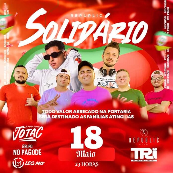 O Republic Club anuncia o REPUBLIC CLUB SOLIDÁRIO, em apoio às famílias afetadas pelas cheias em Jaguari. No sábado, dia 18 de maio, uma noite especial e de solidariedade está sendo preparada, com a alegria e diversão habitual de uma das casas de eventos mais requisitadas da região.
