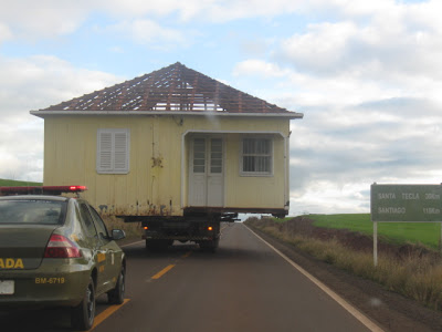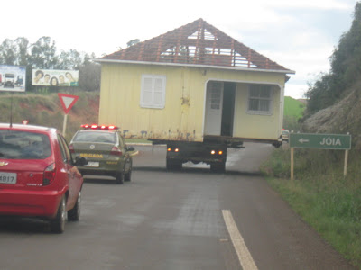 O ex-vereador Pedro Bassin viu e fotografou uma cena inusitada esta semana, enquanto viajava pela RS 377, entre Augusto Pestana e Joia. Um caminhão levava uma casa e, embora a Brigada estivesse como batedor, o trânsito praticamente parou, pois ninguém podia ultrapassar. E quem vinha em sentido contrário, precisava saltar fora, indo para o acostamento ou subindo em barrancos.