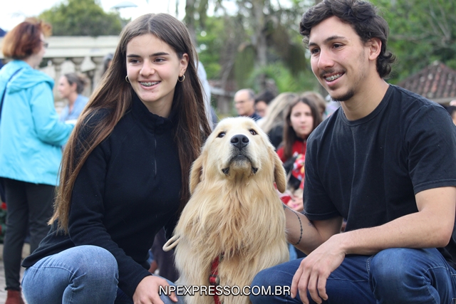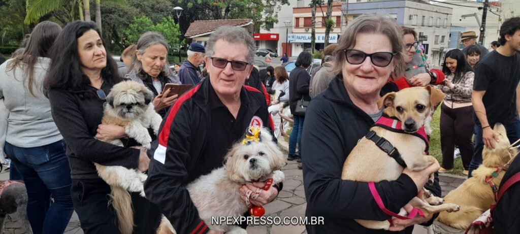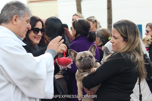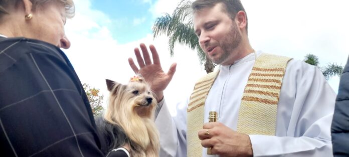 A cerimônia, conduzida pelos padres Aodomar e Valter, atraiu um grande número de pessoas no pátio da Igreja Matriz e seus animais de estimação, a maioria cães e gatos.