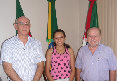 O prefeito Ribeiro e o vice Antolini com a aluna.