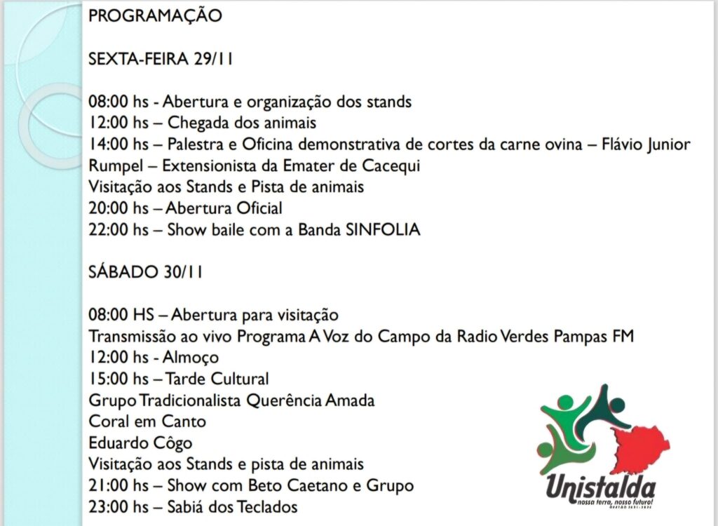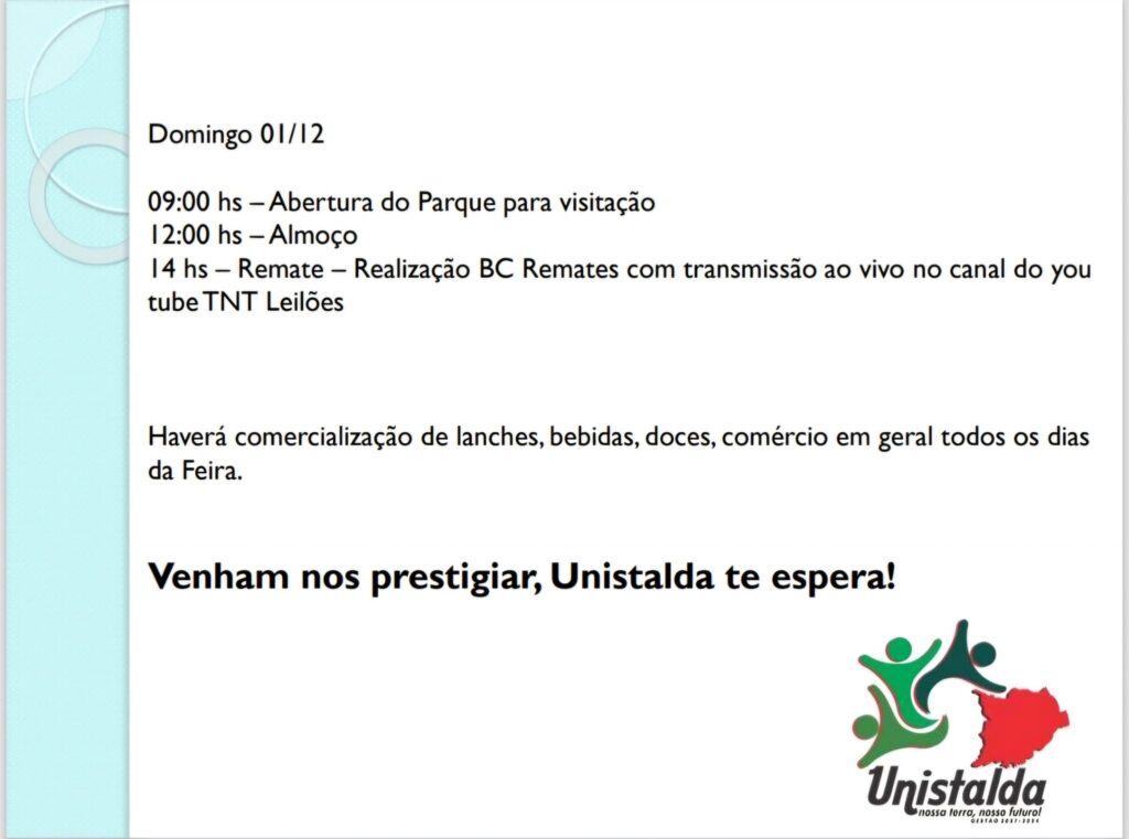 Os estandes abrem às 8h. A abertura oficial do evento será na sexta-feira (29), às 20h. Às 22h, acontece o show baile com a Banda Sinfolia. No sábado (30), a programação inclui tarde cultural com shows de Beto Caetano e Grupo e Sabiá dos Teclados à noite. No domingo, último dia da feira, a visitação começa às 9h. Após o almoço, haverá leilão com transmissão pelo YouTube do TNT Leilões.