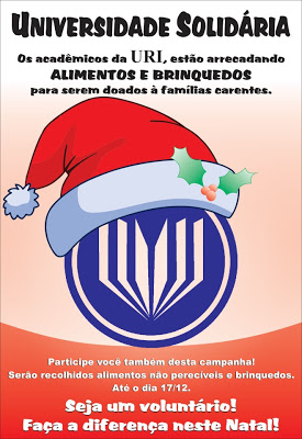 Acadêmicos de vários cursos da URI estão trabalhando para fazer mais feliz o natal de muitas famílias pobres de Santiago, por meio da campanha “Universidade Solidária”. Até o dia 17 de dezembro estão sendo arrecadados alimentos e brinquedos, que podem ser entregues no Serviço de Apoio Estudantil (SAE), na URI ou no Centro de Estágios e Práticas Profissionais, na rua Benjamin Constant. As doações serão entregues para famílias indicadas pelo Cras. Mais informações no fone (55) 3251-3151, com Maique.