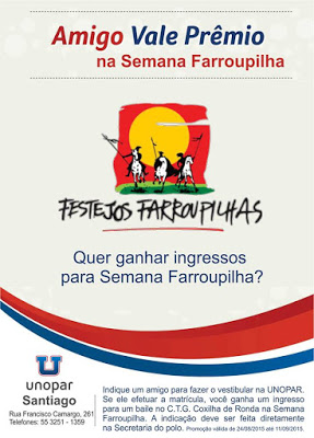 O Polo de Santiago lançou a promoção Amigo Vale Prêmio na Semana Farroupilha. Indique um amigo pra fazer o vestibular na Unopar. Se ele fizer a matrícula, você ganha um ingresso para um baile no Coxilha de Ronda. A indicação deverá ser feita diretamente no Polo, até 11 de setembro.